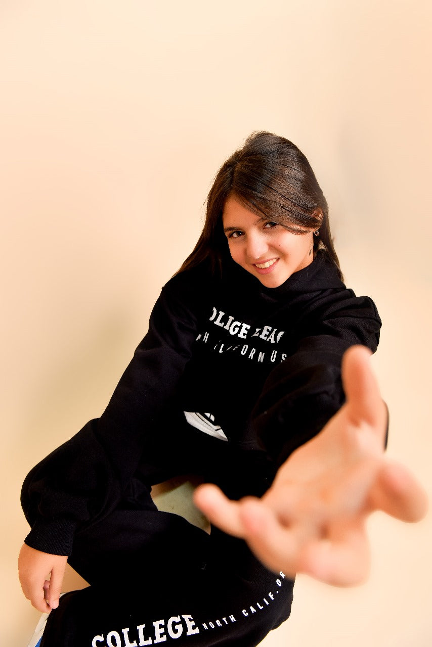 A cozy 3-piece athleisure set featuring a relaxed cropped “College League” hoodie, a lightweight ribbed knit top with a sporty “02” graphic, and soft wide-leg joggers with matching lettering. Designed for comfort, layering, and a modern, casual look.