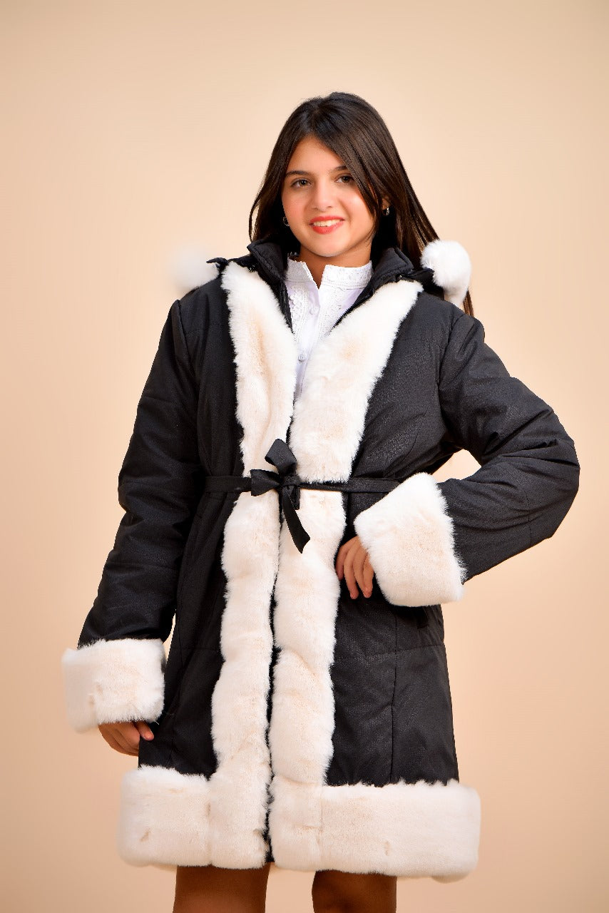 A cozy, elegant kids’ winter coat featuring a soft cream color with plush faux-fur trimming along the collar, cuffs, and hem. It includes a matching belt for a snug, stylish fit and offers a warm, luxurious look—perfect for chilly days while keeping your child both comfortable and fashionable.