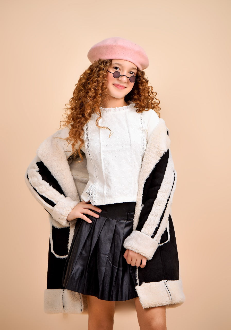 chic shearling-style piece with cream faux fur lining and trim. It features a cozy, soft texture with a tailored fit, long sleeves, and lapel-style collar. The design combines elegance and comfort, making it perfect for staying stylish and warm during the colder months.