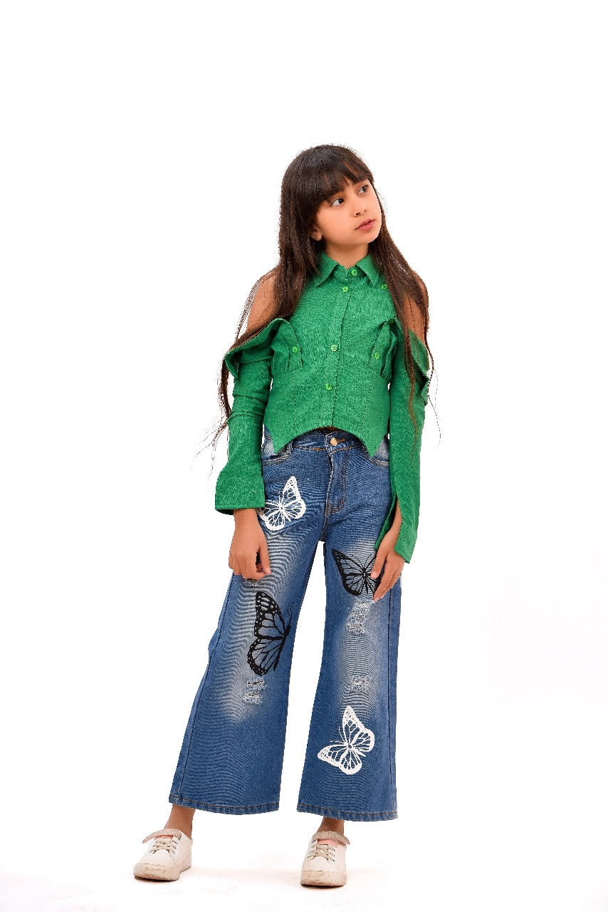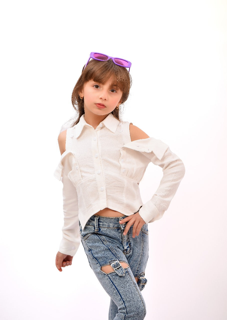 A chic white & green cold-shoulder blouse with a modern cut and soft fabric. Designed with button details and a trendy cropped fit—perfect for girls who love a fashionable, standout look.